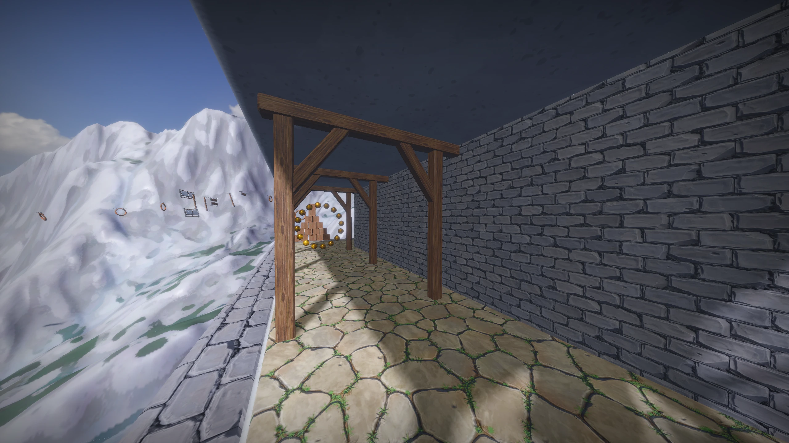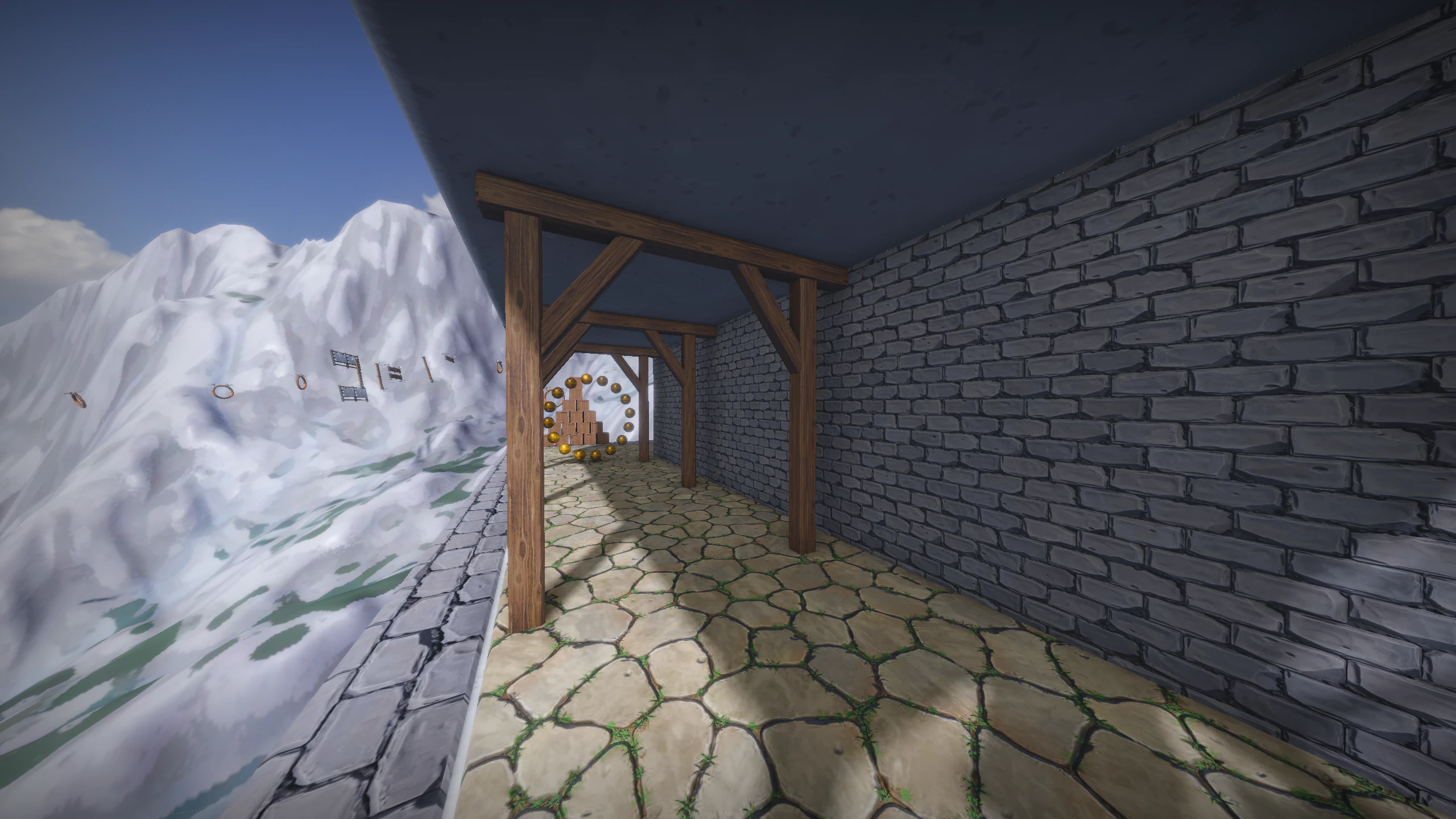 Collision detection and rigid body dynamics run through the Jolt Physics engine. Physics meshes are defined directly in Blender alongside the visual geometry, which kept the workflow unified but made the integration somewhat tricky to get right. The stack of boxes on the hillside is a fully simulated rigid body pile that reacts to the player. Audio is handled by SoLoud, which provides full 3D positional sound, used for in-world effects throughout the course.