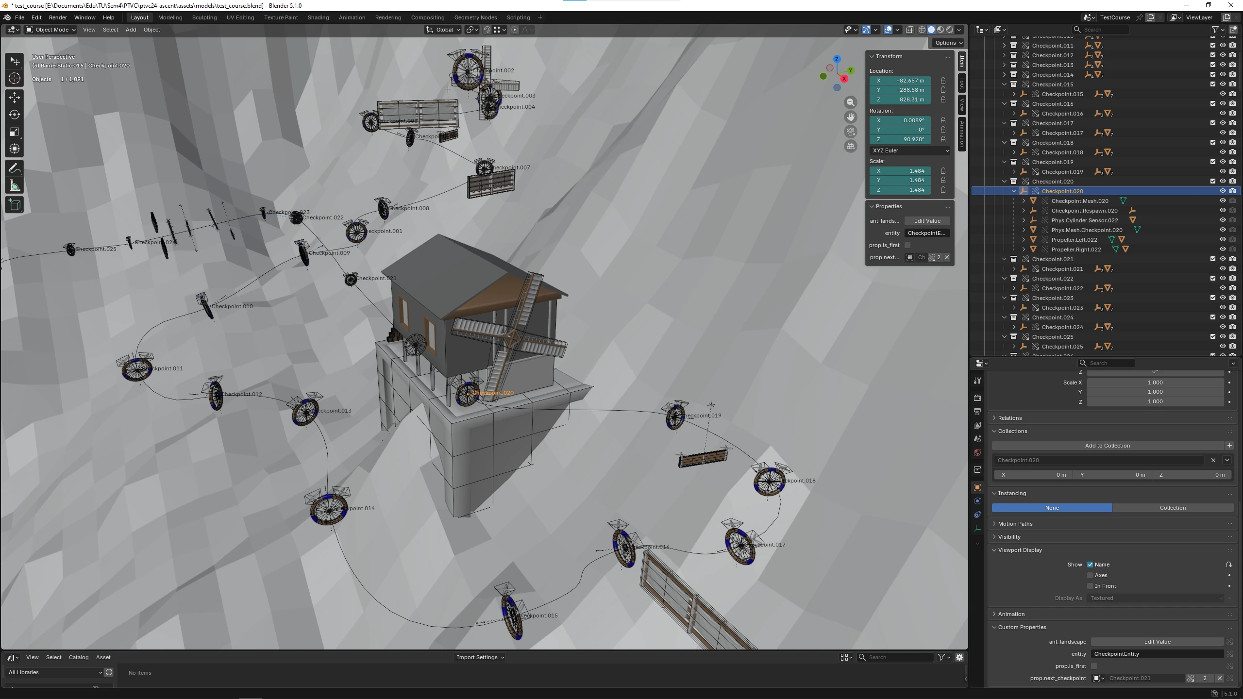 The level was built entirely in Blender, including all the modelling. Entities such as obstacles and checkpoints are placed and configured directly in the scene using Blender's custom properties feature, which exports cleanly into the glTF file and is read at load time. To lay out the track I wrote a set of Python scripts inside Blender for placing and adjusting the checkpoint sequence. Having Blender serve as the full editor for geometry, entities, and tooling made iteration fast.