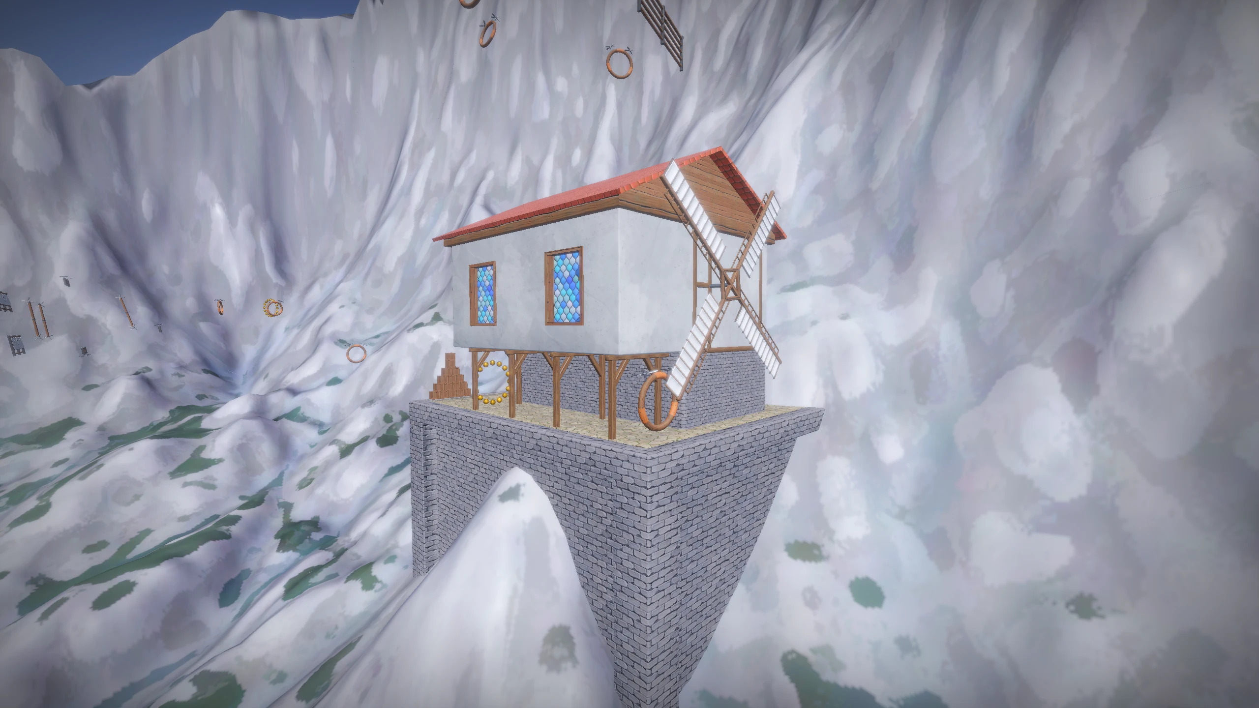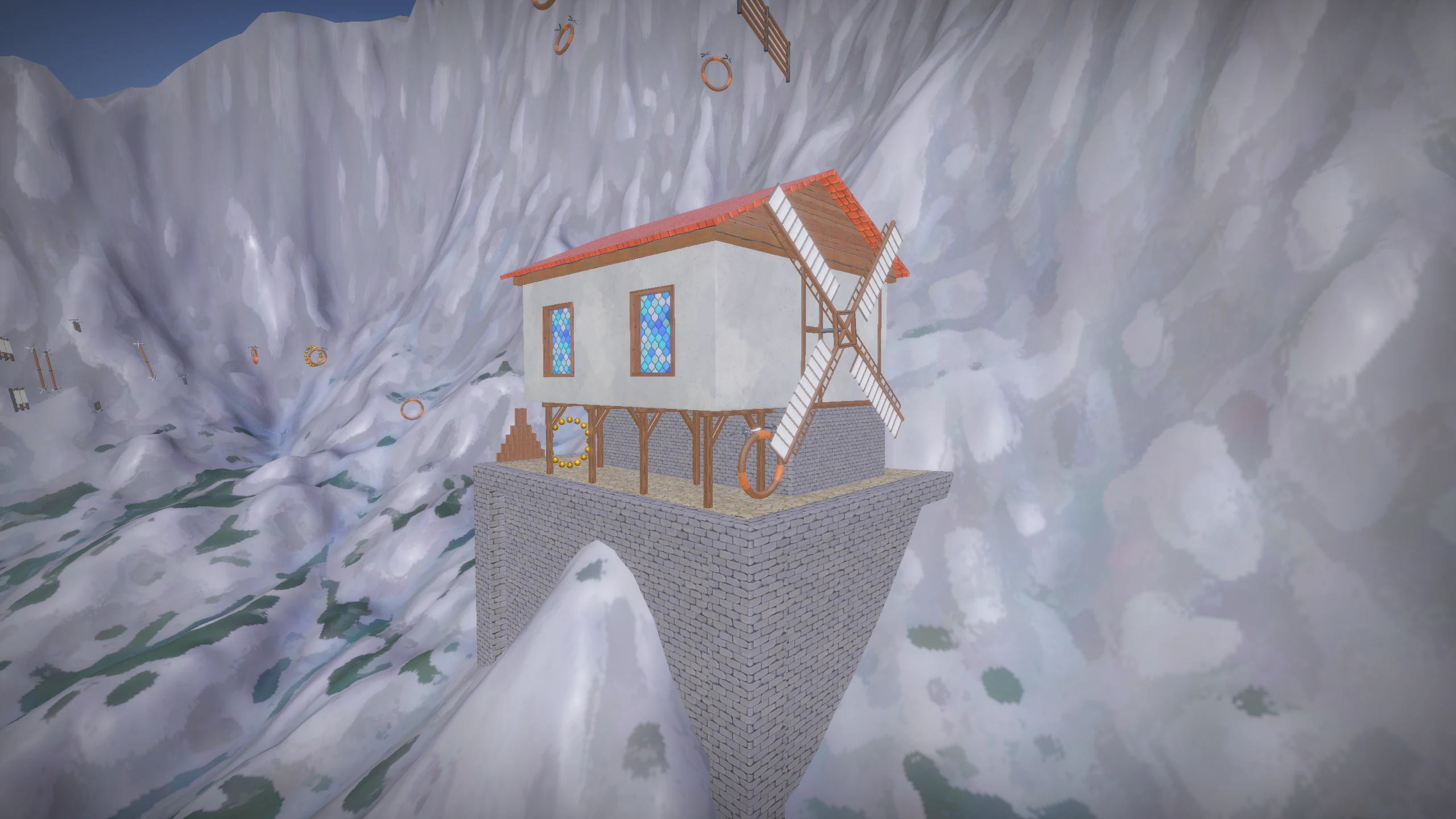 The mountain uses hardware tessellation driven by a height map, with tessellation level computed per patch based on screen-space size. The terrain has a matching physics collider generated from the same height data. The water surface also uses tessellation combined with animated height maps to produce geometric waves. The wave normals are not interpolated, which gives the water a more abstract, stylised quality rather than a photorealistic one.
