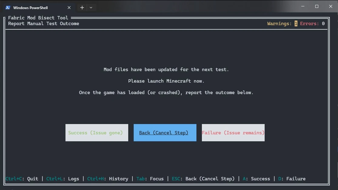 The core of the tool is a bisection search. It splits the pool of candidate mods in half, asks you to run the game and report whether the issue occurred, then eliminates whichever half is clean. Each round cuts the search space in half, so even a modpack with hundreds of mods converges to a result in a handful of steps. The user interface walks you through each test one at a time, so there is no guesswork involved.